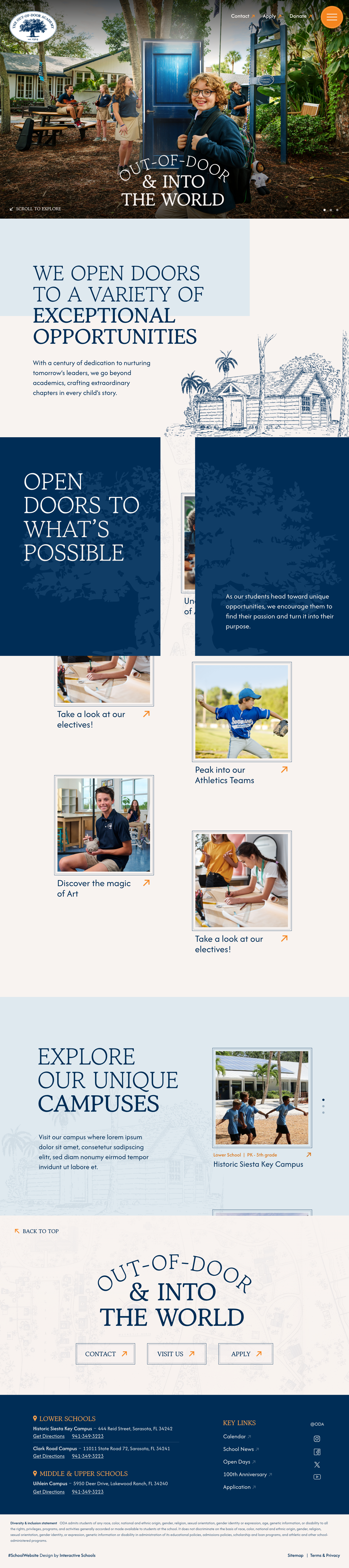 The idea for the “Out-of-Door & Into the World” campaign grew directly from the school’s name and logo. I used the door as a metaphor for opportunity, reflected in both the photography and the homepage experience, where one section opens on scroll like a double door, revealing what awaits at ODA.